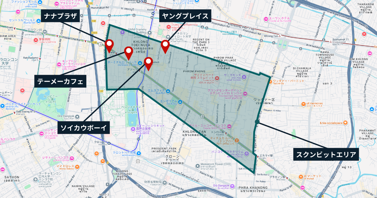スクンビットエリアの夜遊びスポットは、ソイカウボーイ、ナナプラザ、テーメーカフェ、ヤングプレイス。